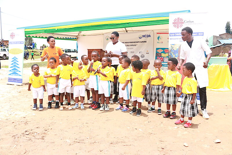Abayobozi bitabiriye umuhango bagaburiye abana, mu gihe abarezi bo mu marerero bahawe ibikoresho byo kwifashisha mu mirimo yabo ya buri munsi, birimo imikeka n’ibikinisho bigamije gufasha abana kwiga bakina.